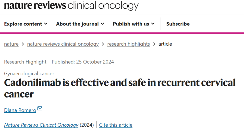 继在2024年国际妇科癌症学会全球会议(IGCS 2024)上作为Late-Breaking Abstract(LBA)以口头报告形式重磅发布,以及同期在顶级医学期刊《柳叶刀》(THE LANCET)上发表后,卡度尼利一线治疗晚期宫颈癌重磅III 期研究数据再次登录国际顶级学术期刊。